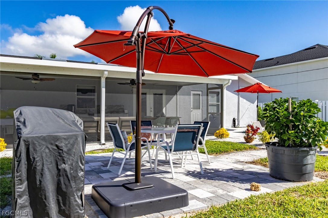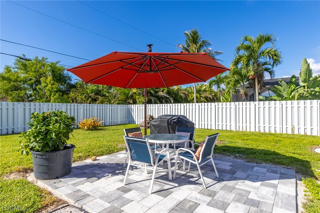 Fully paved sitting area by the saltwater pool with grill and huge umbrellas with solar lights.