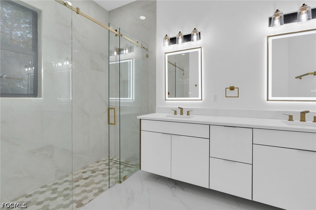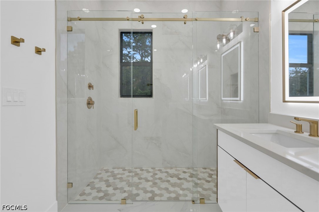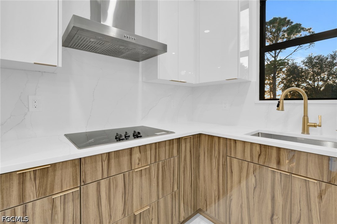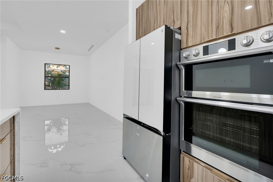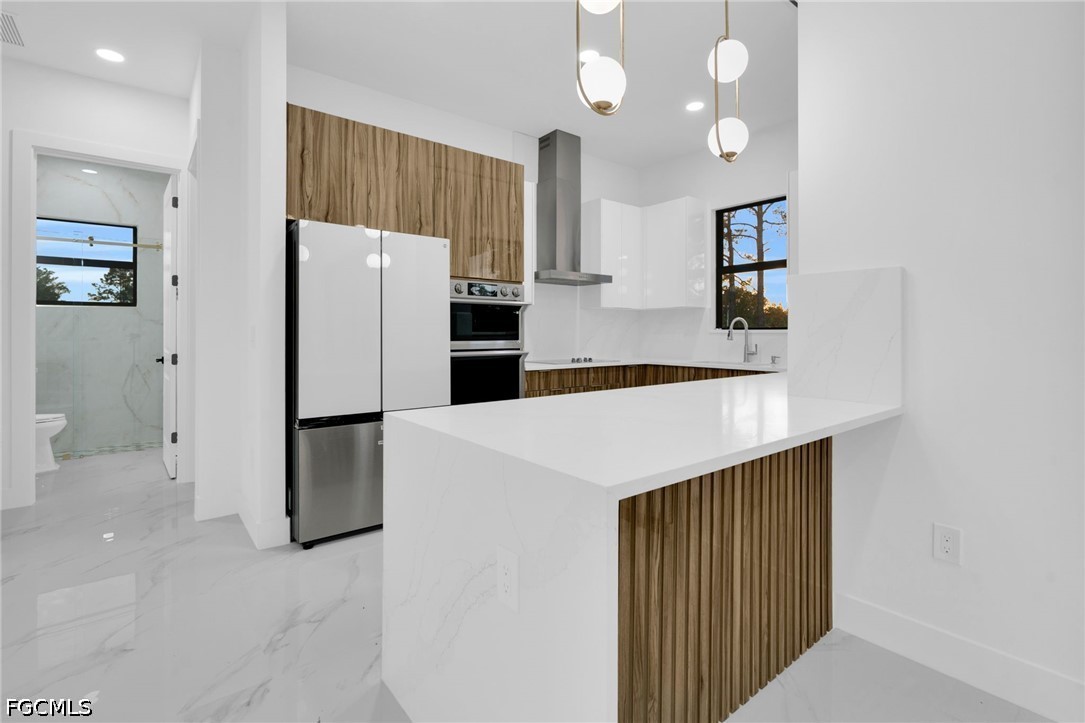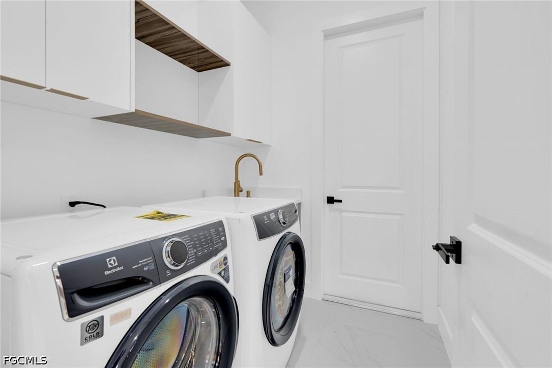 Inside, the home showcases high-end finishes throughout, including elegant white tile flooring, stylish wood accents, and a modern kitchen equipped with premium cabinetry and striking gold stainless steel appliances. A washer and dryer are included for your convenience. Impact-resistant windows and doors enhance both safety and energy efficiency.
