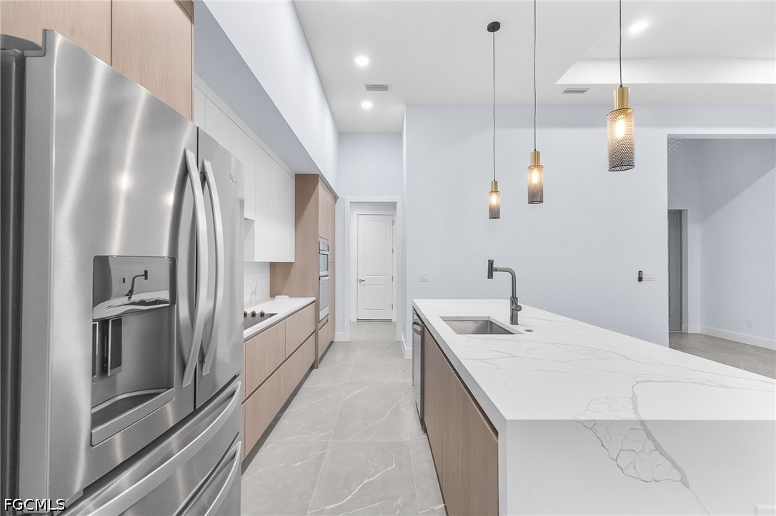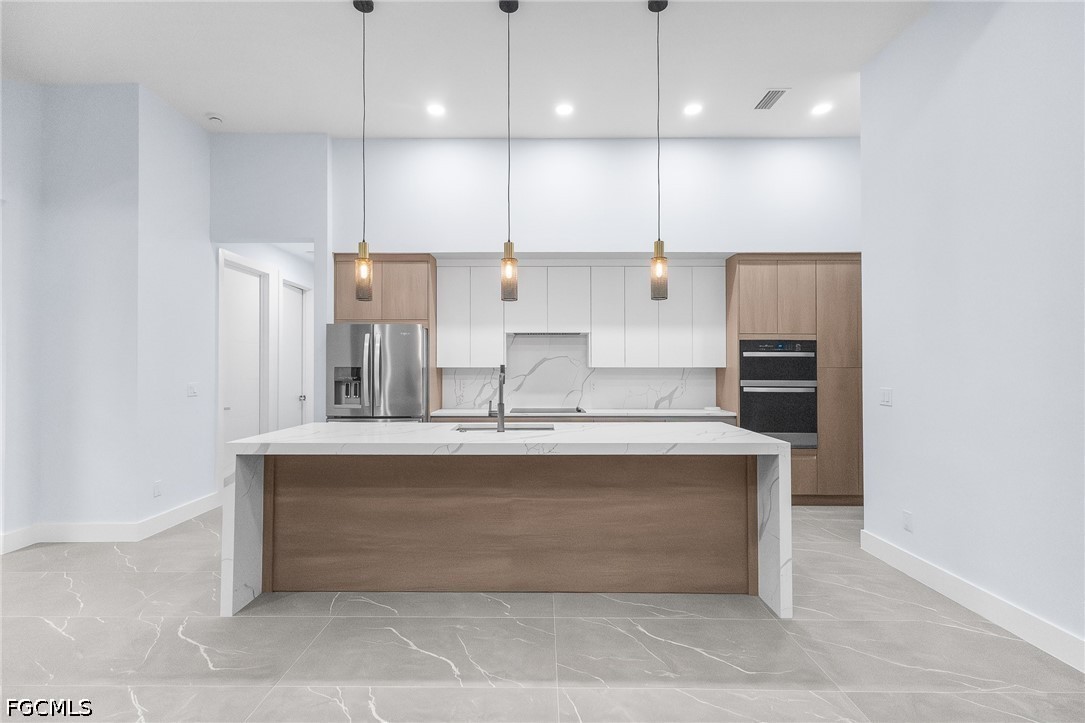 The interior features a sophisticated kitchen with quartz countertops, custom cabinetry, stainless steel appliances, and a spacious island perfect for entertaining. The open living areas are filled with natural light and flow effortlessly into the outdoor space, creating the ultimate indoor-outdoor lifestyle.
