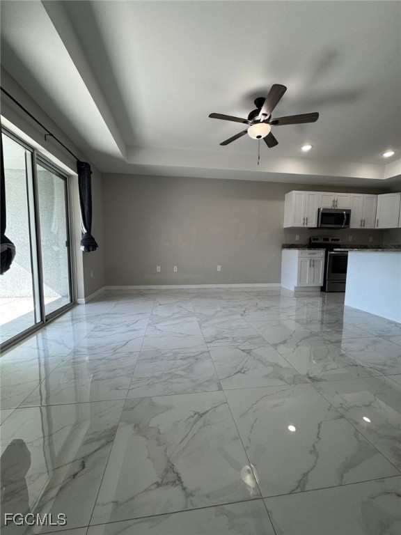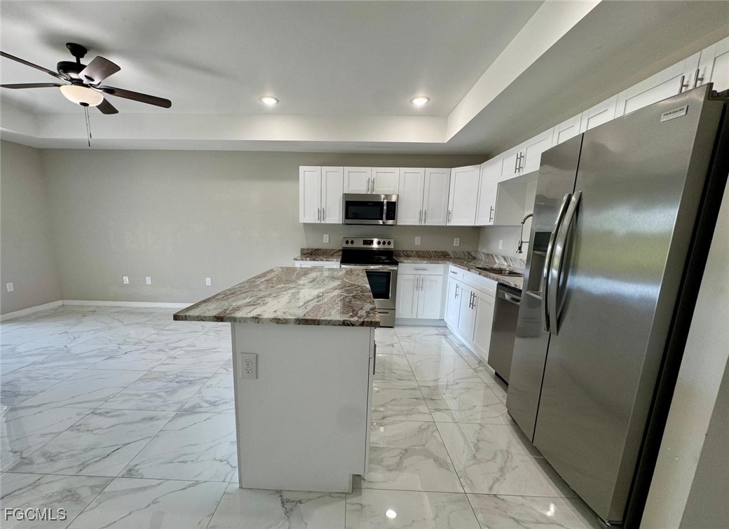 Welcome to this stunning 3-bedroom, 2-bathroom duplex, offering 1,200 square feet of modern living space designed for comfort and style. Step inside to an open-concept layout featuring gleaming marble-inspired tile floors that flow seamlessly from the spacious living area to the gourmet kitchen. The kitchen boasts white shaker cabinets, elegant quartz countertops with a beautiful veining pattern, stainless steel appliances including a range, microwave, dishwasher, and refrigerator, plus a convenient island perfect for casual dining or entertaining.