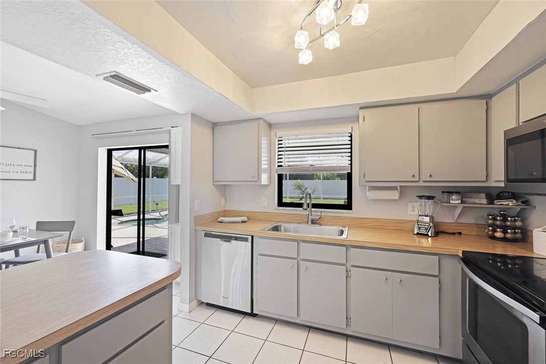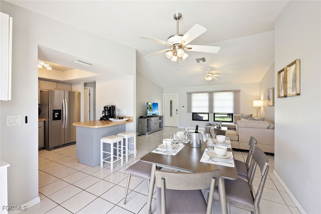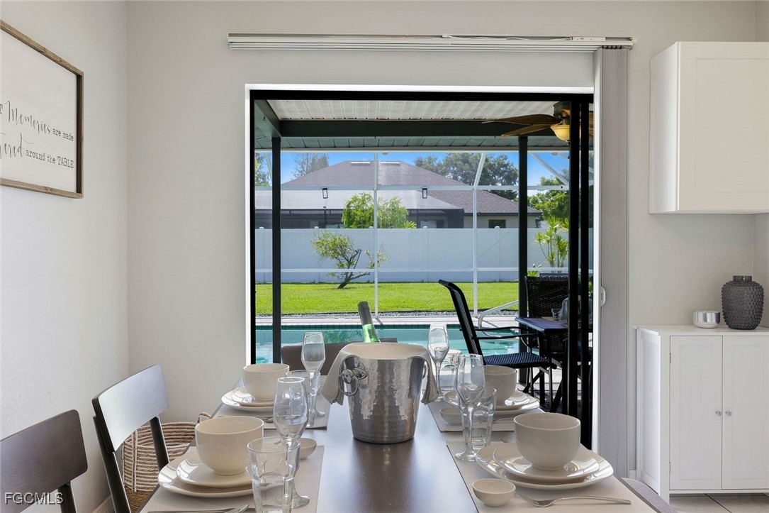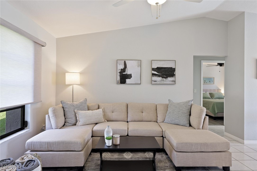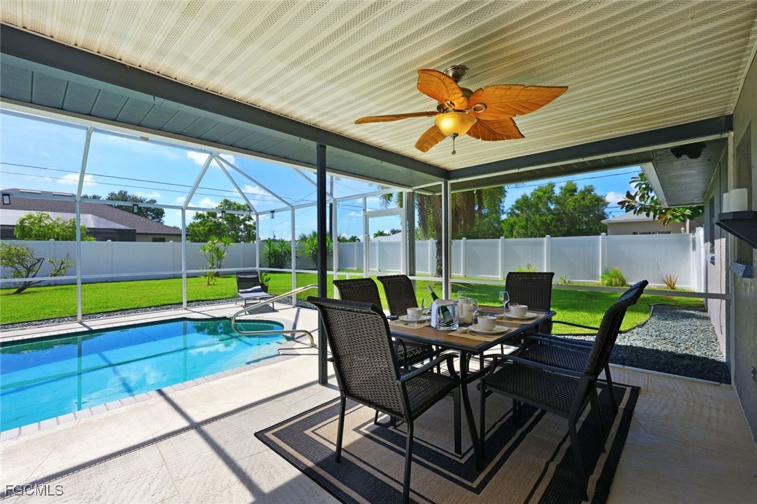 Welcome to this cozy home, turnkey with heated pool and spa, huge fully fenced backyard, situated on a slightly oversized lot in the heart of Cape Coral. Designed to live larger than its stated square footage, the home features a bright and efficient open split-bedroom floor plan, tile and vinyl plank flooring throughout, vaulted ceilings and an abundance of natural light. Pocket sliding doors are leading to a generously sized, covered and screened-in lanai, offering a private and serene setting for year-round relaxation and entertaining. The private fenced yard gives you plenty of space to garden or let kids and pets play safely. Tucked away in a peaceful neighborhood just off Country Club, you're close to everything. Perfectly located near Midpoint Bridge and Del Prado Blvd for quick access to schools, medical facilities, shopping, dining, parks and boat ramps. This is the perfect family home including peace of mind, no flood zone, no flood history, all assessments paid.