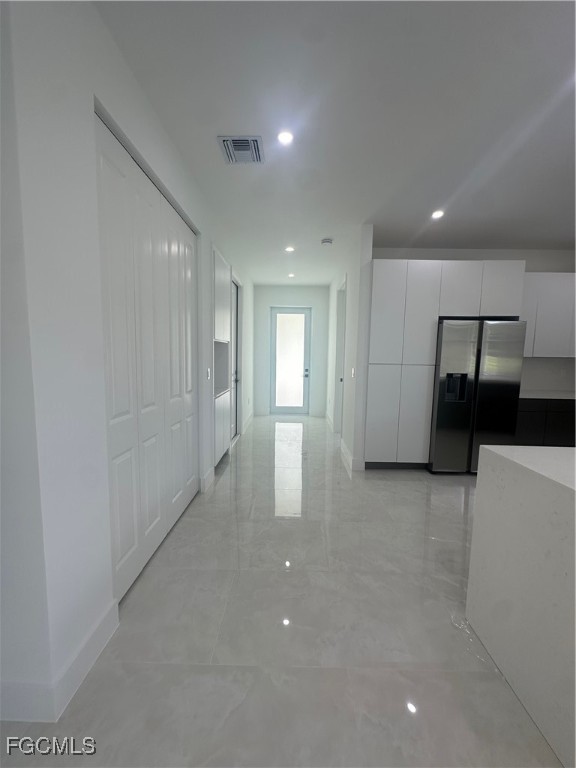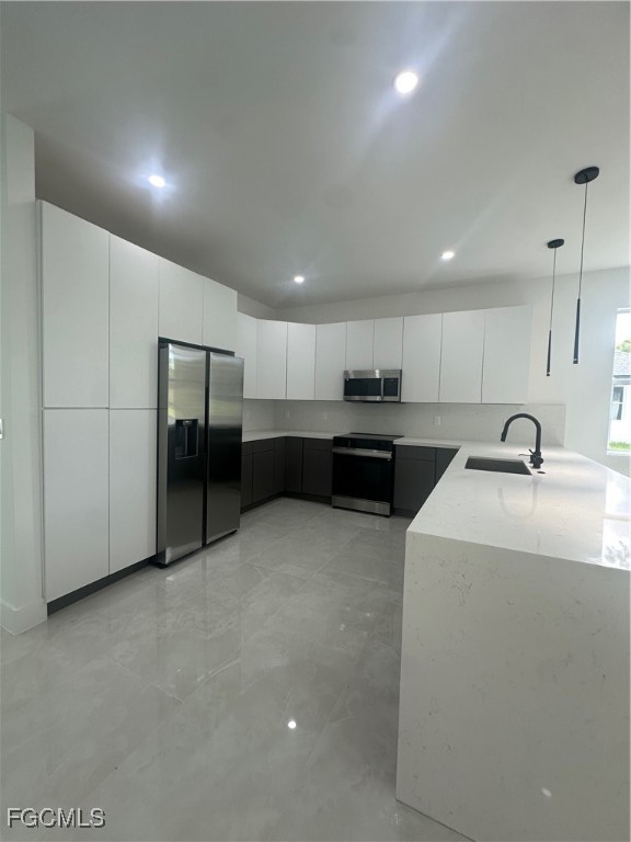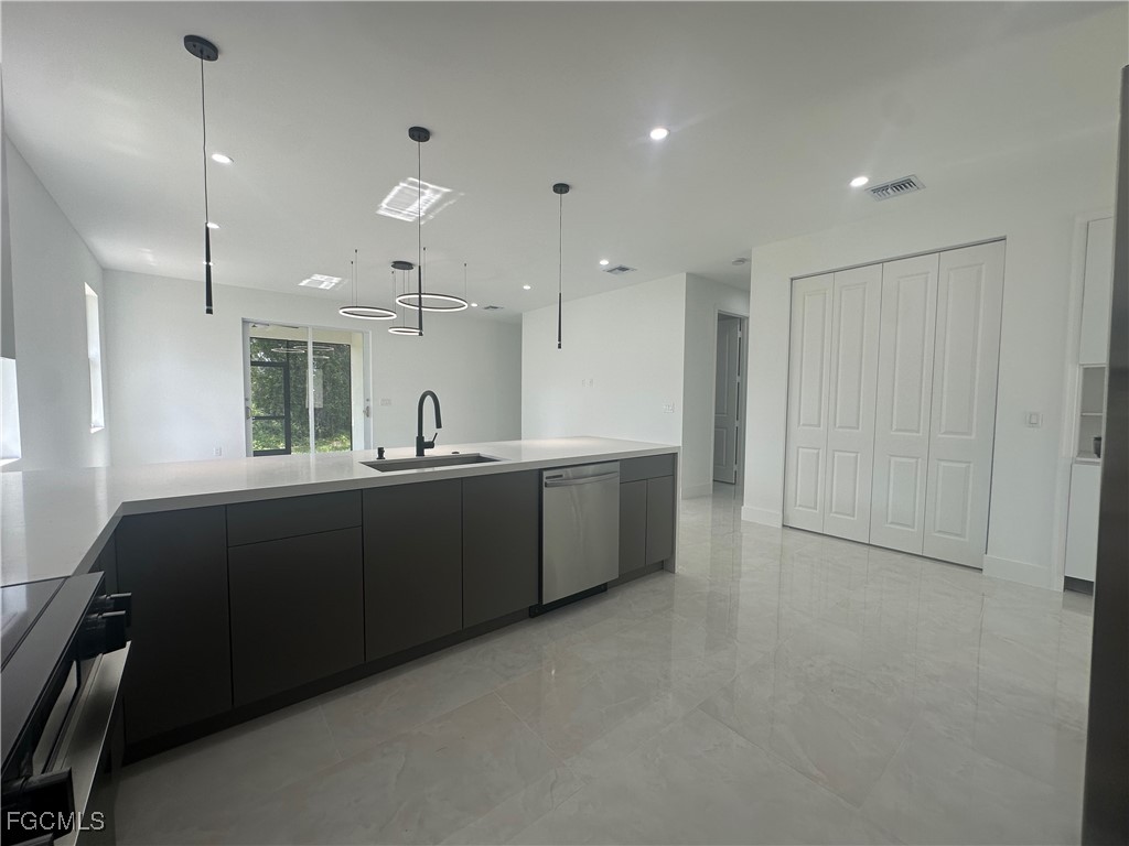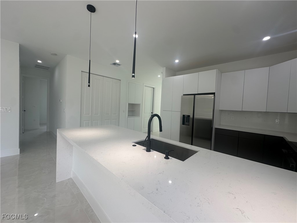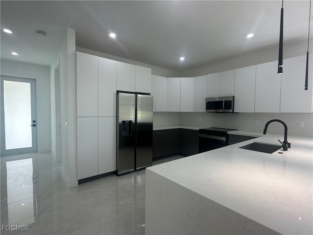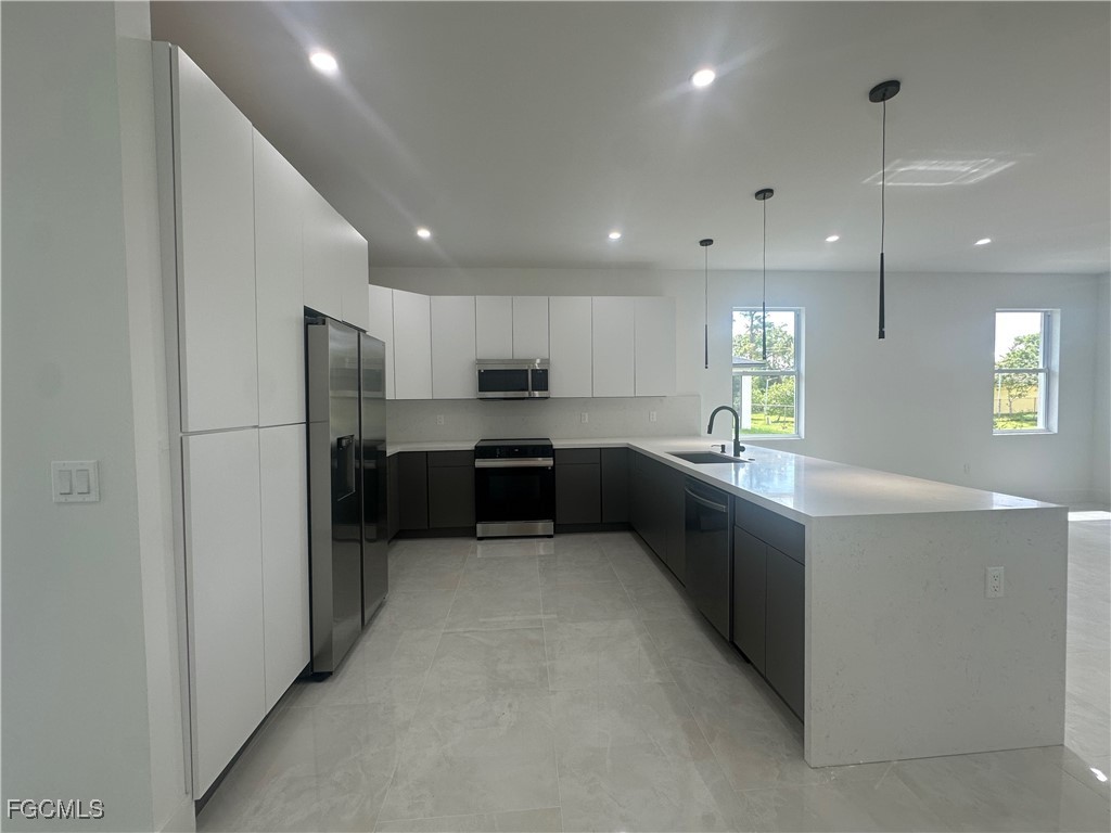 Step into this beautifully designed 4 bedroom, 3 bathroom, 2-car garage home, perfectly blending modern finishes with functional living. Bright open-concept layout with high ceilings and recessed lighting. Stunning porcelain tile floors throughout the entire home. Gourmet kitchen with sleek white cabinetry, quartz countertops, island seating, and modern pendant lighting. Stainless steel appliances and modern fixtures for a sophisticated touch. Spacious living and dining area with sliding glass doors leading to the backyard. Elegant bathrooms with floor-to-ceiling tile showers, frameless glass doors, and floating vanities. Laundry closet with hookups conveniently located inside. Long driveway with plenty of parking. Screened-in lanai overlooking the spacious backyard, ideal for relaxing or entertaining. Impact-resistant windows and doors for peace of mind. this Home is Nestled in a quiet and growing neighborhood and offers easy access to shopping, dining, schools, and major roadways. Enjoy modern living in a serene setting while staying close to all conveniences. Perfect for families, first-time buyers, or as an investment property.